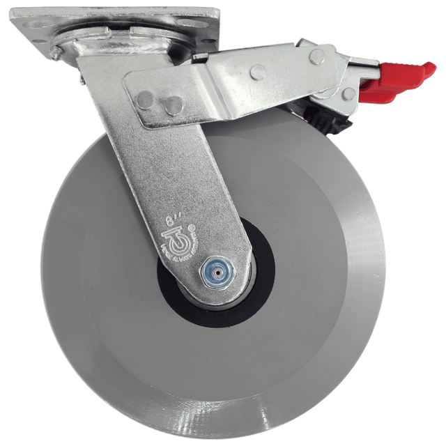 Total Lock Caster locks the wheels and swivel simultaneously with a touch of a toe. Best used where carts are pushed.